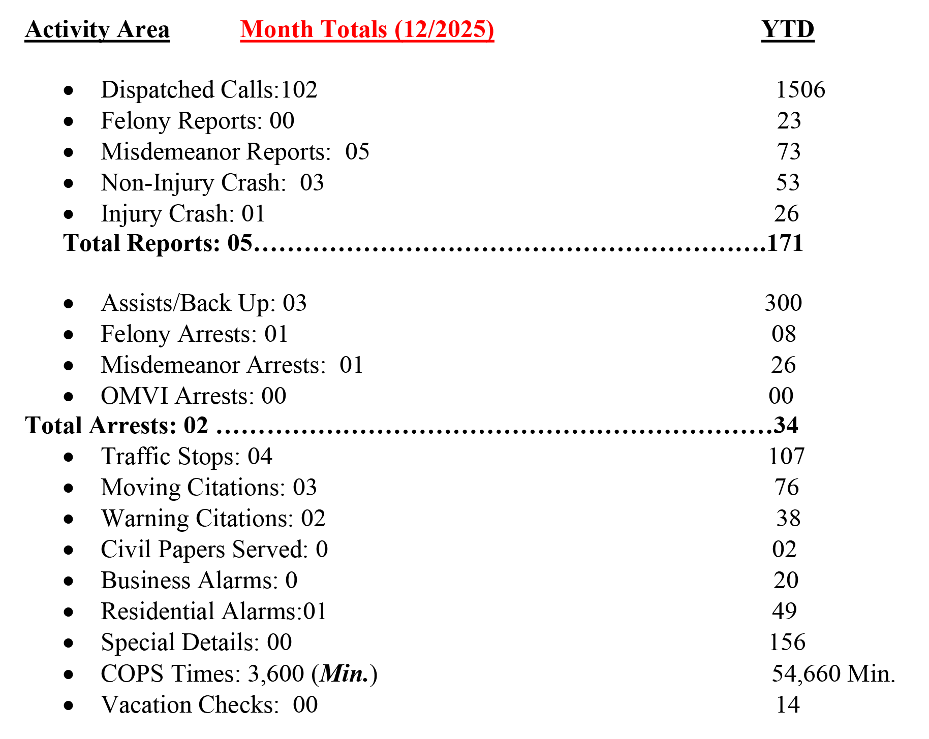 Hanover Township has dedicated officers under contract from the Butler County Sheriff’s Office. This contract can be continued thanks to the support of the Community in approving 1.75 Mil General Operating Levy in 2017. These officers serve the residents of Hanover Township exclusively and pay extra attention to needs of the residents. This contracted service is supplemented by the Sheriff’s Office regular patrol units, which serve the western townships of Butler County. Hanover Township is in District #18. The dedicated officers patrol subdivisions, county roads, cemeteries, parks and business districts. They offer information on laws, vehicles, home security, and crime prevention programs and provide monthly reports to the Township Administration during regularly scheduled Board of Trustees meetings. Summary statistics for the 2025 year reported during the January 2026 Township meeting for two contract units include: